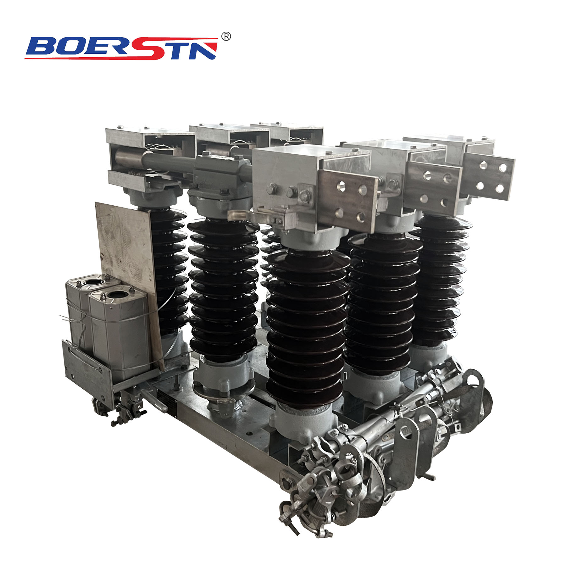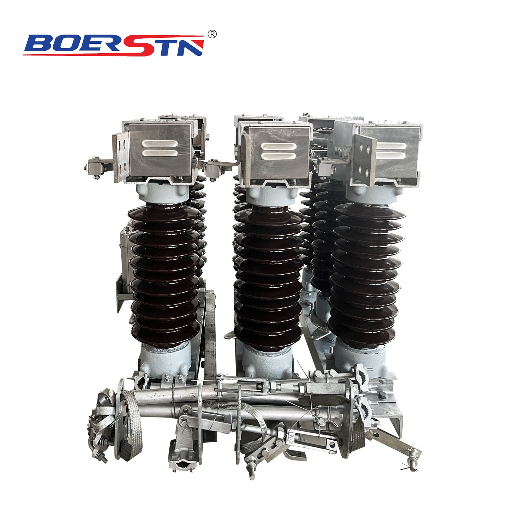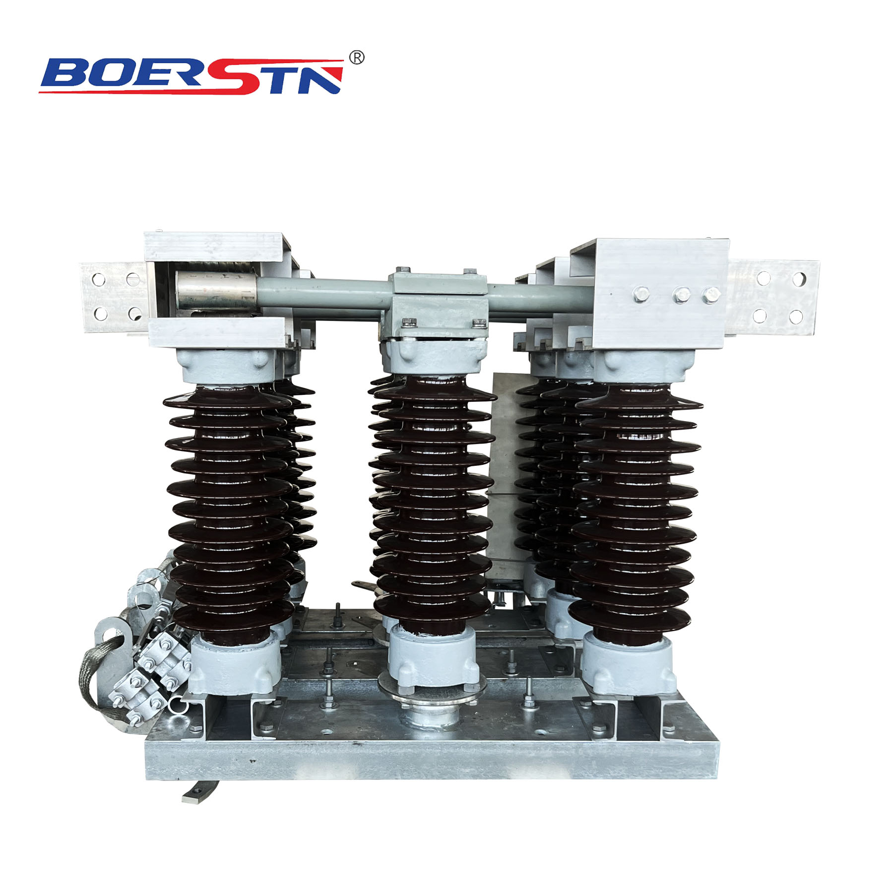 Each pole of the disconnector is equipped with three insulator supports. Each support is assembled by stacking two sections of high-strength solid core porcelain rod insulators. The insulator supports serve to provide insulation between the conductive system and earth, as well as to ensure the mechanical stability of the disconnector under both dynamic and static loads. The lower ends of the insulator supports at both ends are directly fixed to the base, with their upper ends securing the fixed contacts. The lower end of the middle insulator support is fixed to the bearing base, while its upper end secures the conductive blade.