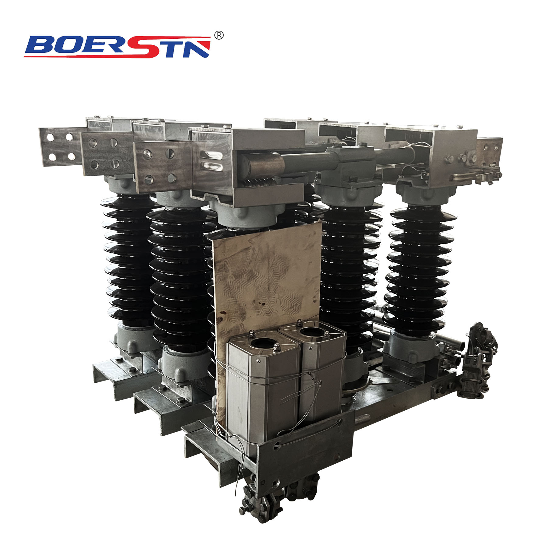 The base is welded by channel steel and steel plates, with a rotating bearing base installed in the middle. The inner cavity of the channel steel on the main pole base is equipped with a transmission connecting rod and an interlocking device for the main blade and earthing blade.